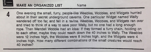 Here, we see the Weebles, the Wobbles, and the Widgets, all working together to rescue poor Wally Widget. (An aside: Before passing this out, I stressed that I want them to become confident problem-solvers in real world math situations. Then I gave them this problem, which is patently absurd. They laughed.)
